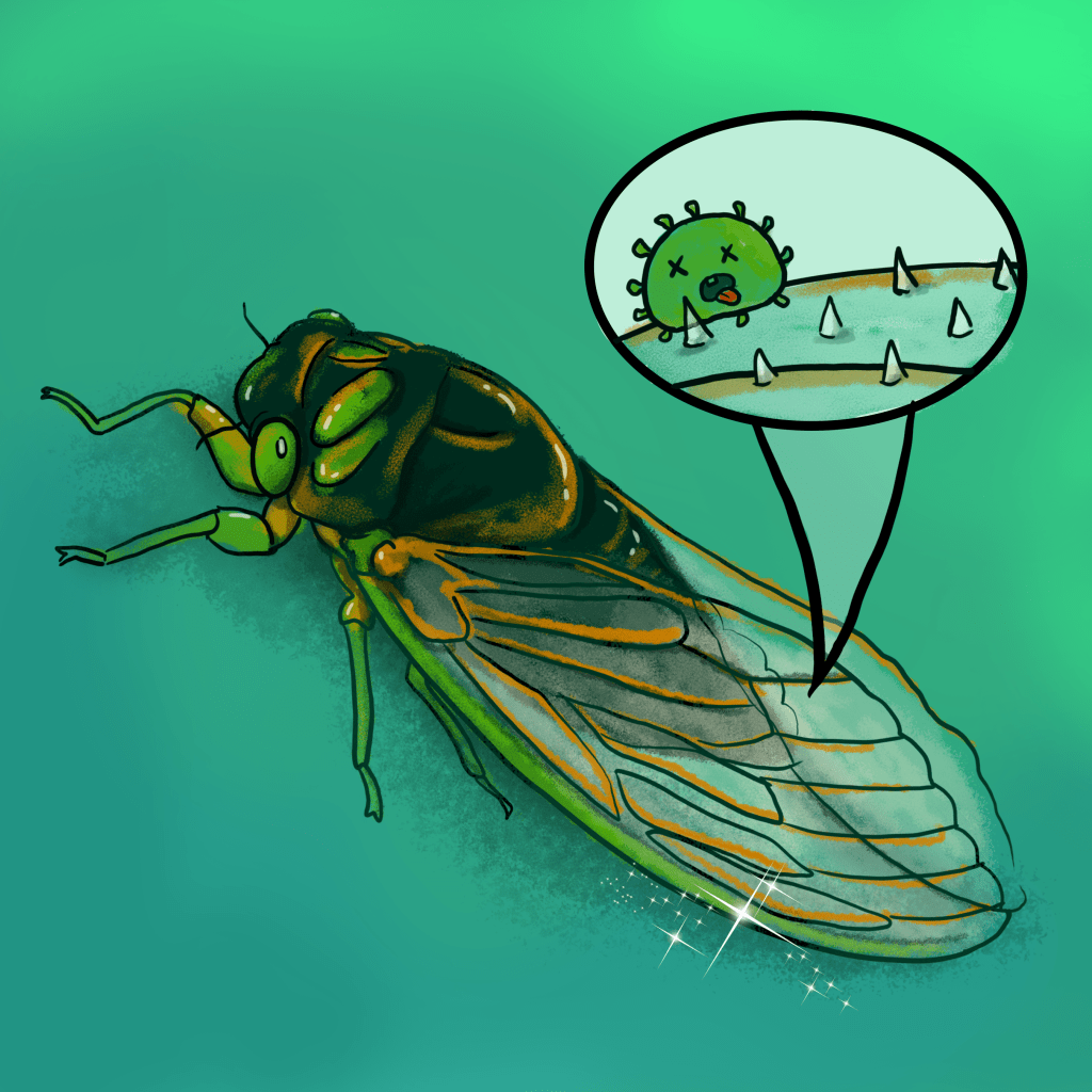 But new research has uncovered that cicada wings are covered in teeny tiny (so tiny they can only be seen under an electron microscope) pillars. These pillars, or spikes as I like to imagine them, can puncture the membrane of bacteria as they try to move across the wing’s surface. Using artificially created versions of cicada wings, scientists could show that these spikes were as effective as bleach for killing pesky germs.